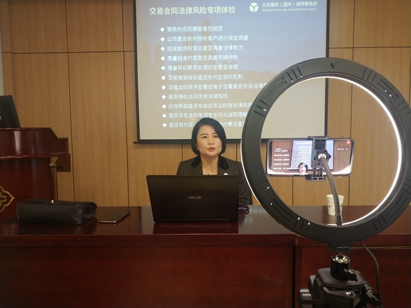 此次活動,特邀溫州市十佳律師、溫州市政府行政法規(guī)合法性審查專家周春萍律師開展直播。直播以公司法律風(fēng)險防范為主題,以企業(yè)法律案例分享了合同審查、員工社保、競業(yè)禁止協(xié)議等方面的法律風(fēng)險。