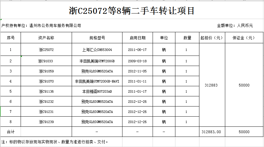 受委托,定于2021年09月03日下午3時,在溫州市天誠拍賣行拍賣廳,對牌號為 浙C25072等8輛二手車(捆綁式,不包括原牌照及商業(yè)保險),按現(xiàn)狀進行公開捆綁拍賣,起拍價312883元,車輛詳情見拍賣文件或溫州聯(lián)合產(chǎn)權(quán)交易中心有限公司網(wǎng)址(m.shvergs.cn)。